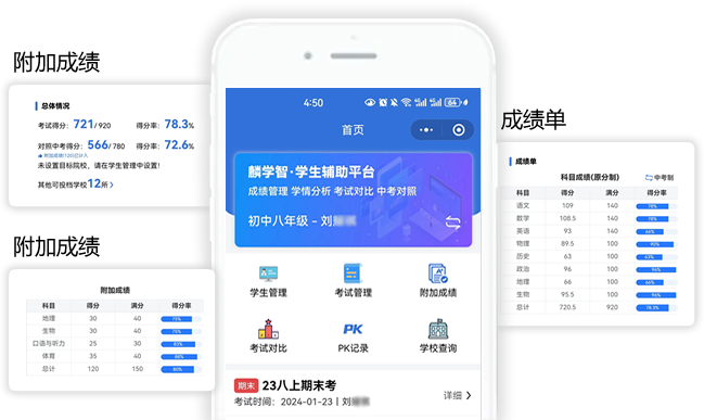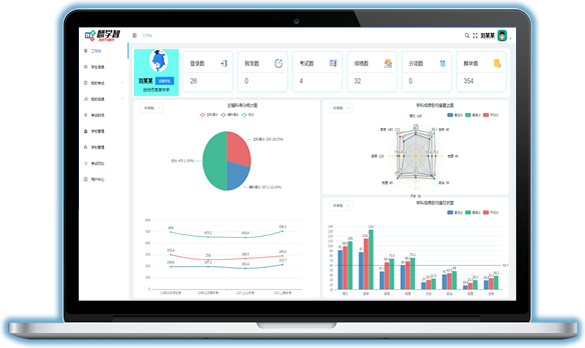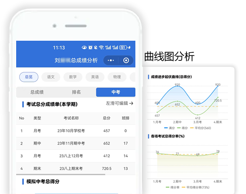 包括单次\多次考试总成绩、科目成绩、考试排名、偏科率等,